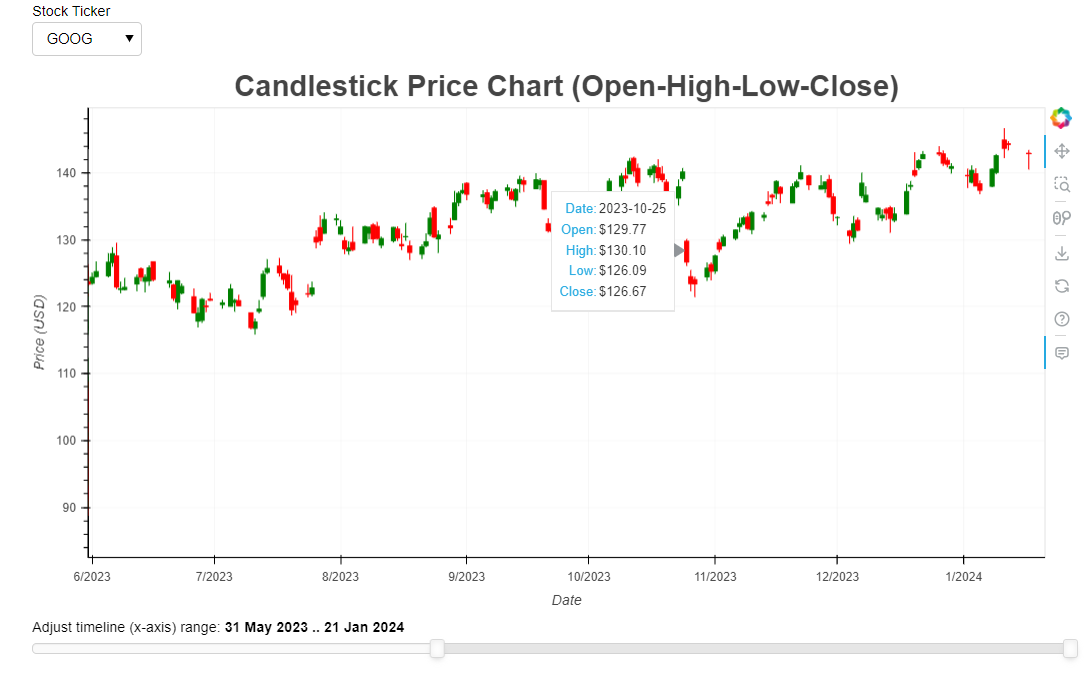 # Define date range for graph start_date = pd.to_datetime('2023-01-01') end_date = datetime.datetime.now() date_rangeX = pd.date_range(start = start_date, end = end_date) # Create lists for ticker ticker_list = ['SPY', 'AAPL', 'AMZN', 'GOOG', 'META', 'NVDA', 'TSLA'] # Start with one ticker ticker = 'TSLA' df_in_use = df[df['Ticker'] == ticker] df_in_use_green = df_in_use[df_in_use['Close'] >= df_in_use['Open']] df_in_use_red = df_in_use[df_in_use['Close'] < df_in_use['Open']] # Create a ColumnDataSource containing only the current ticker #source = ColumnDataSource(df_in_use) source_green = ColumnDataSource(df_in_use_green) source_red = ColumnDataSource(df_in_use_red) # Create a ColumnDataSource containing all data for filtering source_all = ColumnDataSource(df) # Width is 1 day w = 24*60*60*1000 # 1 day in ms # Create candlelight chart for df_in_use graph = figure(x_axis_type = "datetime", title = "Candlestick Price Chart (Open-High-Low-Close)", x_axis_label = 'Date', y_axis_label = 'Price (USD)', sizing_mode = "stretch_width", height = 500) # Make grid line more transparent graph.grid.grid_line_alpha=0.3 # Add segment and vertical bars for each data row graph.segment(source=source_green, x0 ='Date', y0='High', x1='Date', y1='Low', color="green") graph.segment(source=source_red, x0 ='Date', y0='High', x1='Date', y1='Low', color="red") graph.vbar(source=source_green, x = 'Date', top = 'Open', bottom = 'Close', width = w, fill_color="green", line_color ="green") graph.vbar(source=source_red, x = 'Date', top = 'Open', bottom = 'Close', width = w, fill_color="red", line_color="red") # Make font size of title bigger graph.title.text_font_size = '20pt' graph.title.align = "center" # Set up RangeSlider for timeline timeline_slider = DateRangeSlider( title = "Adjust timeline (x-axis) range", start = date_rangeX.min(), end = date_rangeX.max(), step = 1, value = (date_rangeX.min(), date_rangeX.max()), sizing_mode = "stretch_width") # Add callback code timeline_slider.js_link("value", graph.x_range, "start", attr_selector=0) timeline_slider.js_link("value", graph.x_range, "end", attr_selector=1) # Define Hover Tool hover_tool = HoverTool( tooltips=[ #('Ticker', '@Ticker'), ('Date', '@Date{%F}'), ('Open', '@Open{$0.00}'), ('High', '@High{$0.00}'), ('Low', '@Low{$0.00}'), ('Close', '@Close{$0.00}') ], formatters = {'@Date': 'datetime', } ) # Add hover_tool to graph graph.add_tools(hover_tool) # Create single Selection widget select = Select(title = 'Stock Ticker', value = 'TSLA', options = ticker_list, width = 100, #margin = (5, 5, 5, 80) ) # Create a callback function to kick through changes when a new ticker is chosen callback = CustomJS( args = dict(source_green = source_green, source_red = source_red, source_all = source_all, select = select), code =""" // get the value from the dropdown var ticker_name = select.value; // filter the full data set to include only those from that ticker var data_all = source_all.data; var data_green = source_green.data; var data_red = source_red.data; data_green['Date'] = []; data_green['Open'] = []; data_green['High'] = []; data_green['Low'] = []; data_green['Close'] = []; data_red['Date'] = []; data_red['Open'] = []; data_red['High'] = []; data_red['Low'] = []; data_red['Close'] = []; for (var i = 0; i < data_all['Ticker'].length; i++) { if (data_all['Ticker'][i] == ticker_name) { if (data_all['Close'][i] >= data_all['Open'][i]) { data_green['Date'].push(data_all['Date'][i]); data_green['Open'].push(data_all['Open'][i]); data_green['High'].push(data_all['High'][i]); data_green['Low'].push(data_all['Low'][i]); data_green['Close'].push(data_all['Close'][i]); } else { data_red['Date'].push(data_all['Date'][i]); data_red['Open'].push(data_all['Open'][i]); data_red['High'].push(data_all['High'][i]); data_red['Low'].push(data_all['Low'][i]); data_red['Close'].push(data_all['Close'][i]); } } } // commit changes source_green.change.emit(); source_red.change.emit(); """) # Call function on change of selection in drop down list select.js_on_change("value", callback) # Create a separate callback to update the Hover Tool hover_callback = CustomJS( args=dict(hover_tool=hover_tool, select=select), code=""" // get the value from the dropdown var ticker_name = select.value; // Update the ticker name in the Hover Tool hover_tool.tooltips[0][1] = ticker_name; hover_tool.update(); """ ) # Attach the hover_callback to the graph graph.js_on_change("renderers", hover_callback) # create layout layout = column([select, graph, timeline_slider], sizing_mode = 'stretch_width') # show result show(layout)